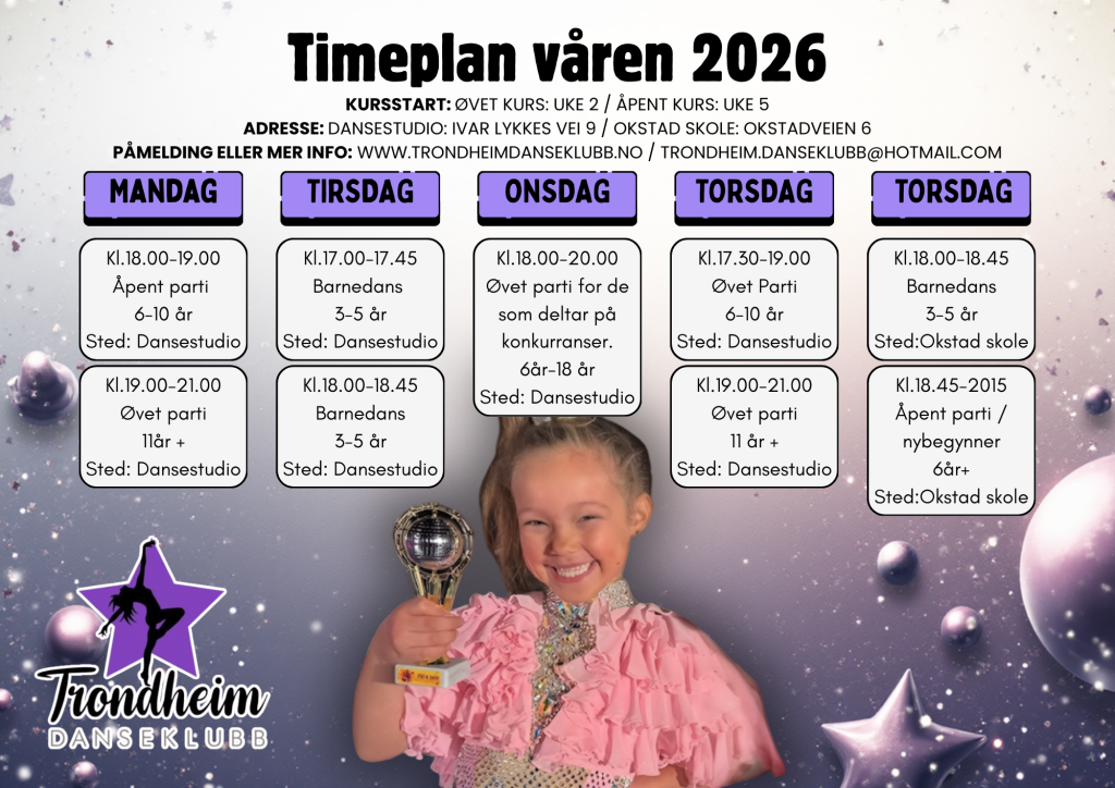 • Onsdager Øvet kurs for de som deltar på konkurranser: Et ekstra tilbud for dansere som deltar i konkurranser. Det anbefales at danseren følger minst ett tilleggskurs, da kursene bygger på hverandre og bidrar til å styrke både teknikk og utvikling.